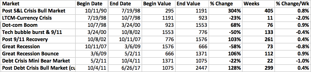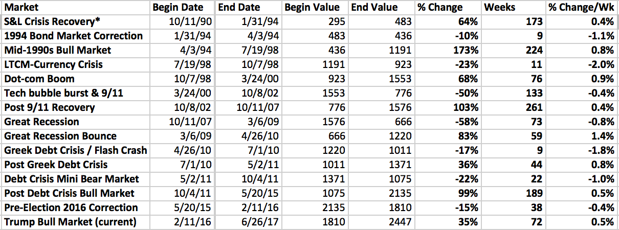 So how does the current bull market really compare to previous bull markets? I went back to S&P500 charts since 1993 noting all the major advances and declines from the market peak to the market bottom. Several long-lasting corrections such as the 2016 multiple-dip in the market in which the S&P 500 declined 15% I counted as a bear market.
