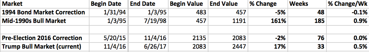 My opinion is that the market's choppy ride from August 2015 through February 2016, while not quite a bear market, was a healthy rotation of money that shook out all the weak hands and set up the building of a new bull market. Remember, the stock market has behaved quite differently ever since the 2016 election season ended - as if the election was a catalyst for the next big stock market move up. In historical context, I believe this action looks most similar to the 1994 choppy market where stock prices were stuck in a volatile range, then 1995 abruptly opened the start of one of the stock market's biggest bull market runs.