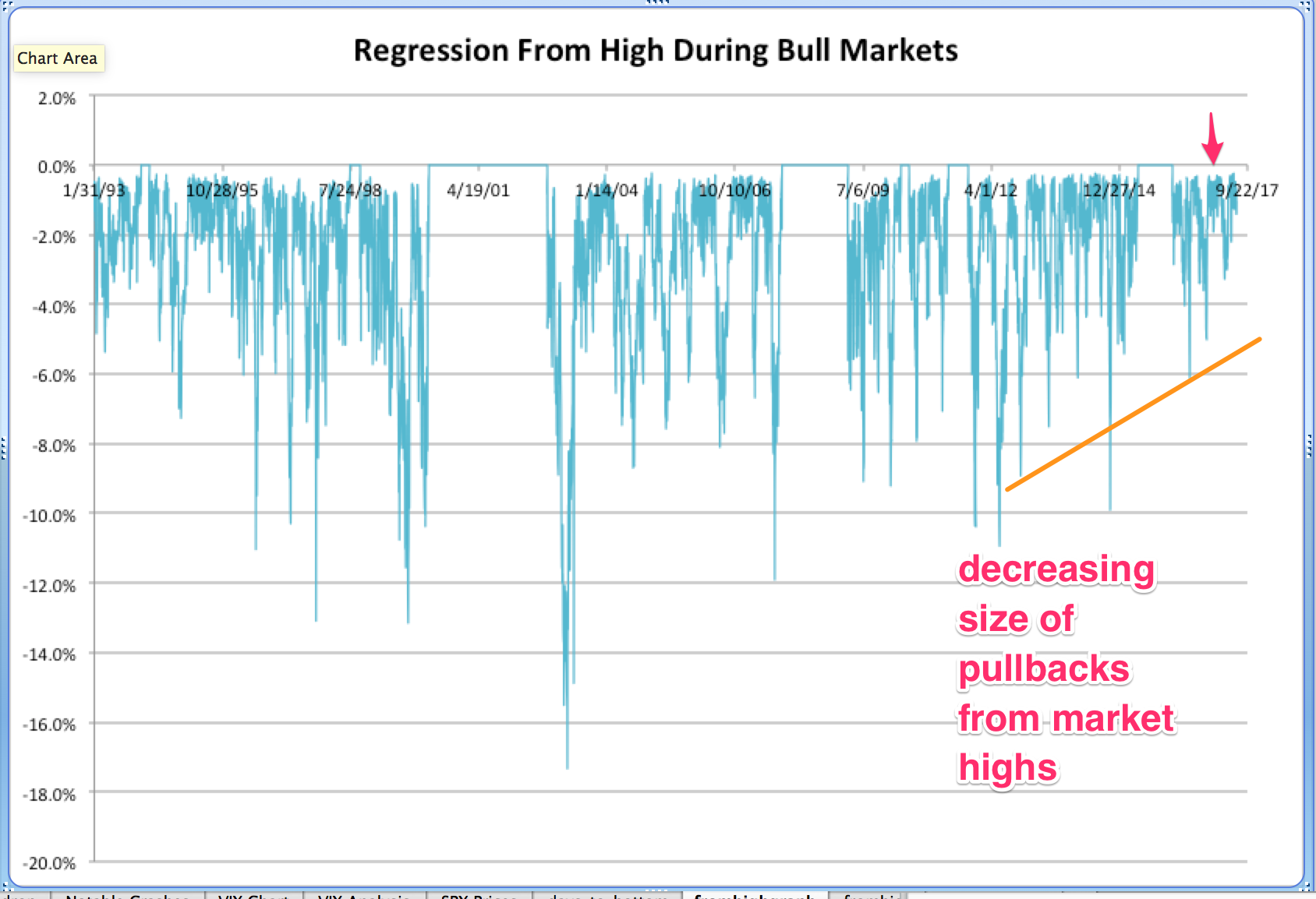 - We are overdue for a pullback from the all time highs, given that the largest pullback from the highs since the 2016 was only 3.1%.